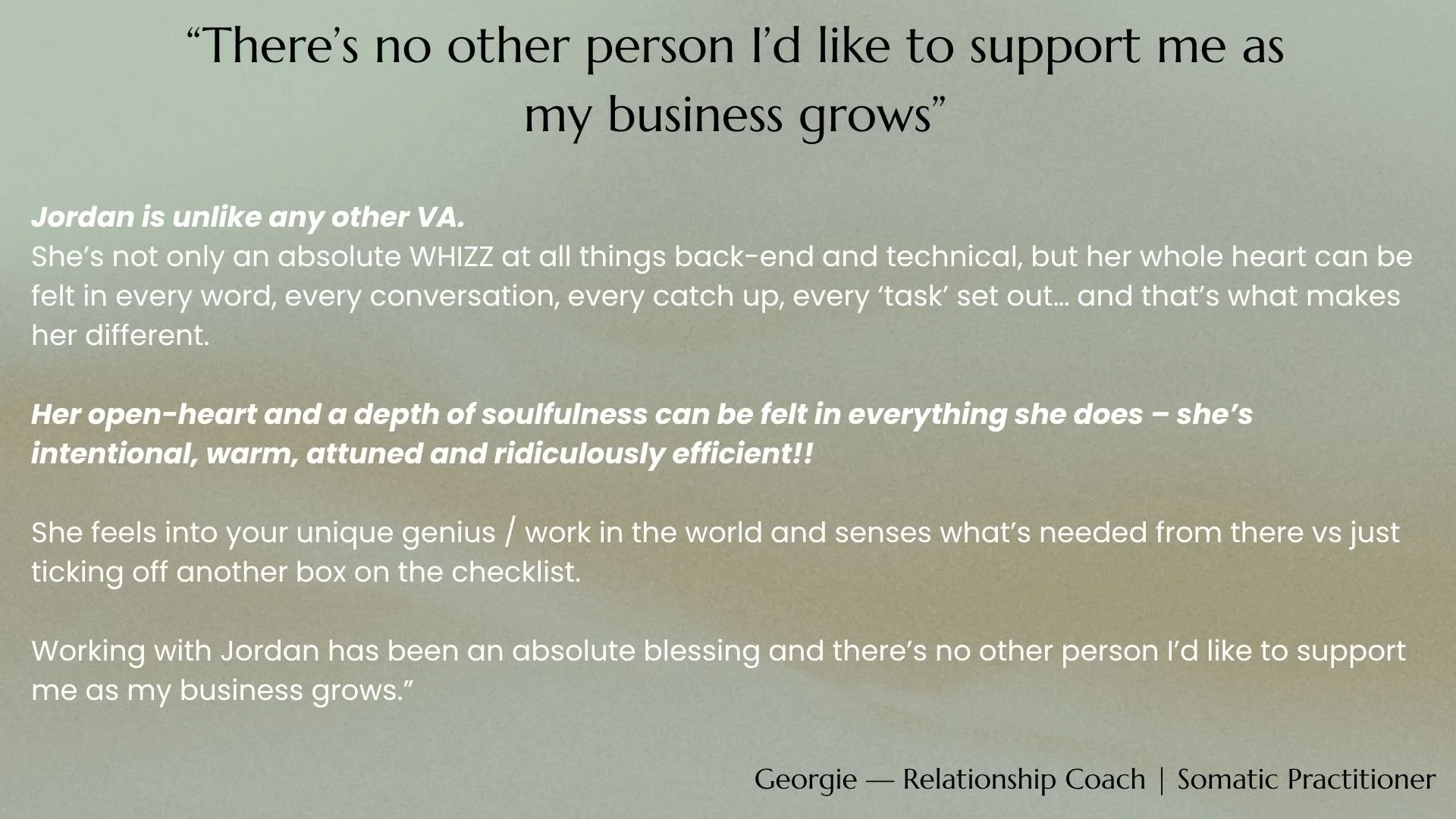 Jordan is an especially great match for heart-centred entrepreneurs wanting someone whose values align to create a powerful impact with their business.”